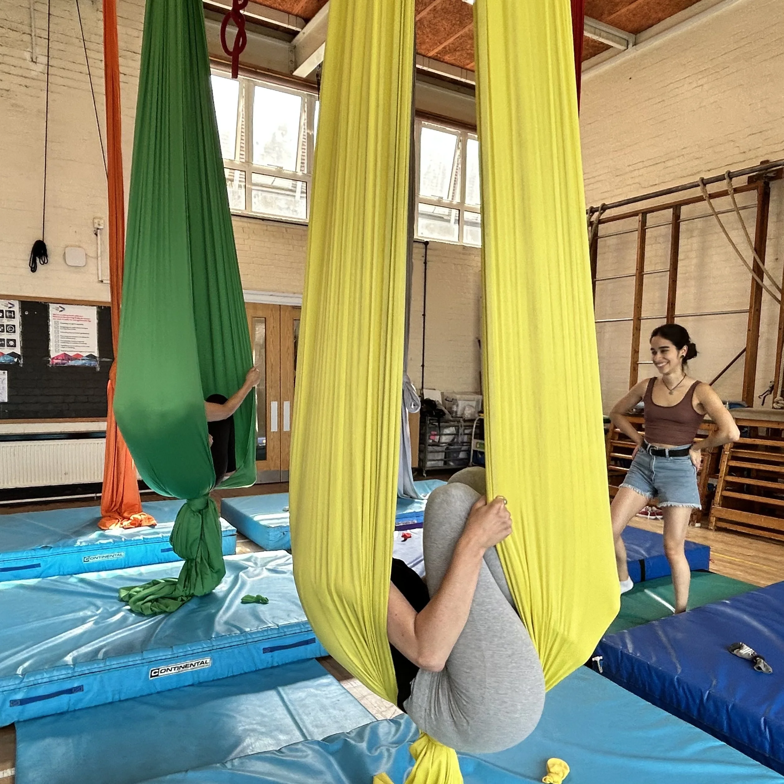 The teachers are professional aerial teachers and performers who have been working in the circus industry for many years as both performers and/or teachers. They are safety conscious, supportive, approachable and sensitive to the needs of beginner students. There are 6 pieces of apparatus and each student will have their own apparatus for the class. The heights may vary slightly so occasionally you may need to do a move on a higher or lower hammock.